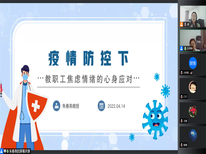 4月14日,校教职工心理健康服务中心邀请15vip太阳集团官网副经理朱春燕教授,以“疫情时期的焦虑情绪应对”为主题,为全校职工开展了一场线上公益讲座,提醒广大教职工做好“心理防疫”。全校500余名教职工线上参加活动。